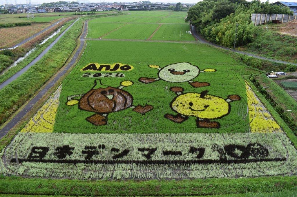 この図柄は、安城市が「日本デンマーク」と呼ばれて100年と安城市の特産品の
